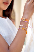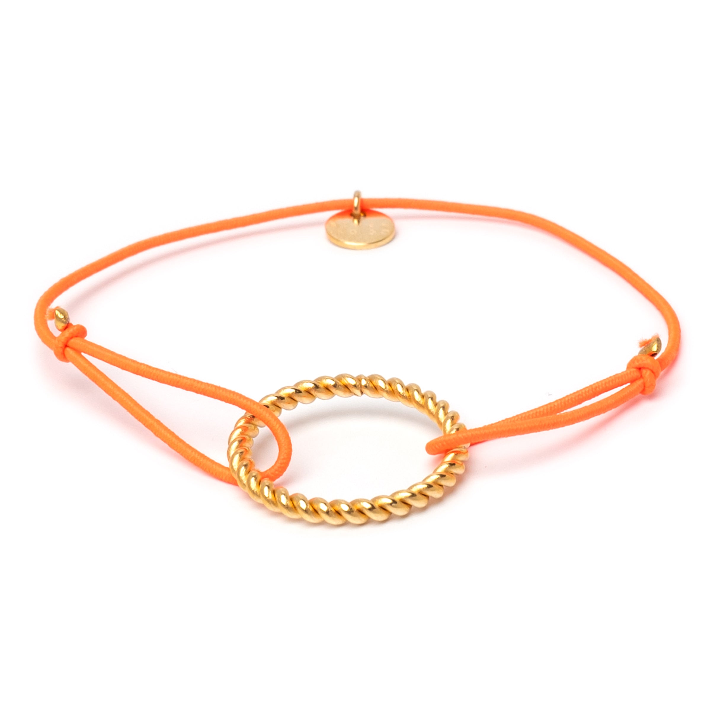 Das Armband Darling Circle hat das Zeug zum Lieblingsstück in deinem Schmuckkästchen. Das elastische Nylon-Band in Neon Orange schmiegt sich elegant an dein Handgelenk. Strahlender Mittelpunkt ist der gedrehte kreisförmige Circle-Anhänger aus 24k vergoldetem Edelstahl.
