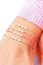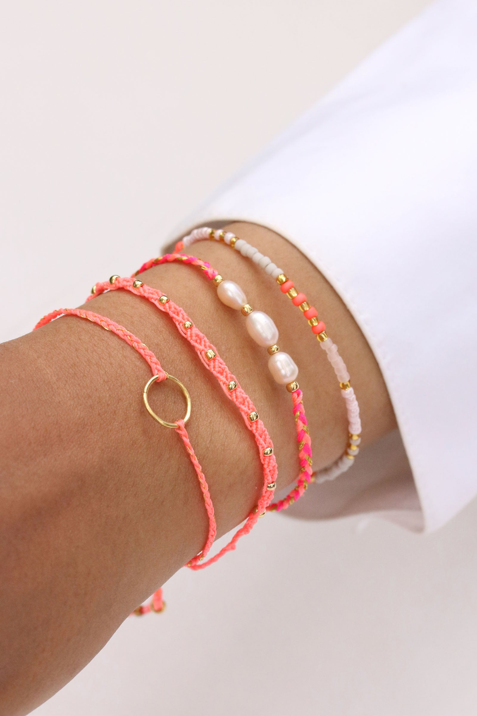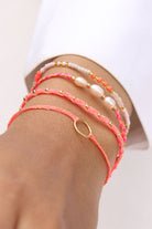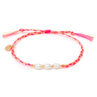 Unser Dolce-Armband ist eine geflochtene Farb-Sensation in den Farben Neon Pink, Neon Coral und Gold. Drei mittig aufgefädelte Süßwasserperlen bringen Sommerferien-Stimmung ans Handgelenk.