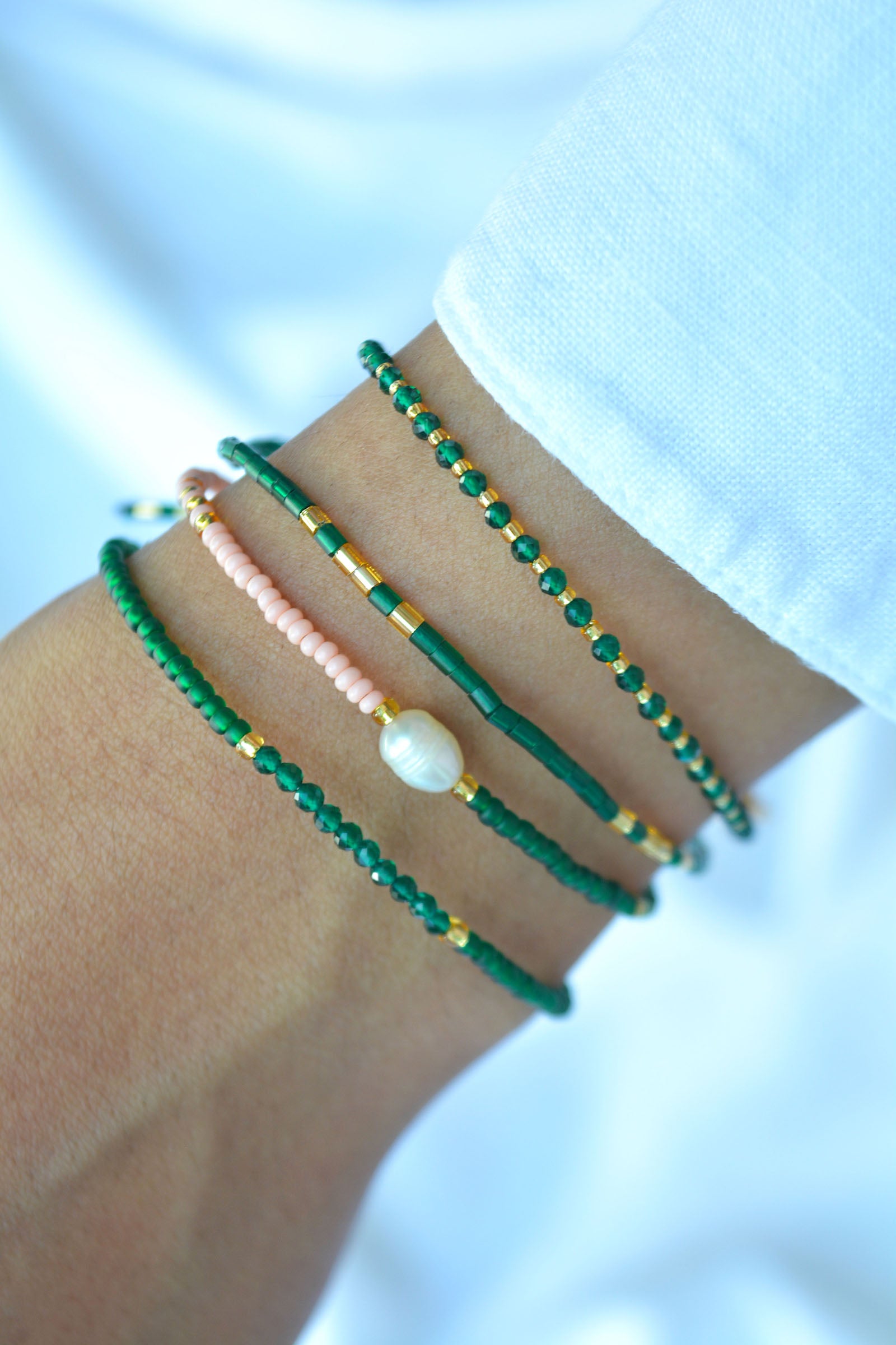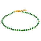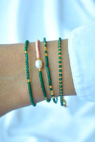 Zahlreiche smaragdgrüne Glassteine umschließen das Handgelenk und funkeln unwiderstehlich im Sonnenlicht. Das Armband Emerald setzt eine edle Note am Handgelenk - solo oder kombiniert mit unseren anderen Bali-Bändchen. Es ist in einer goldenen und einer silbernen Variante erhältlich.
