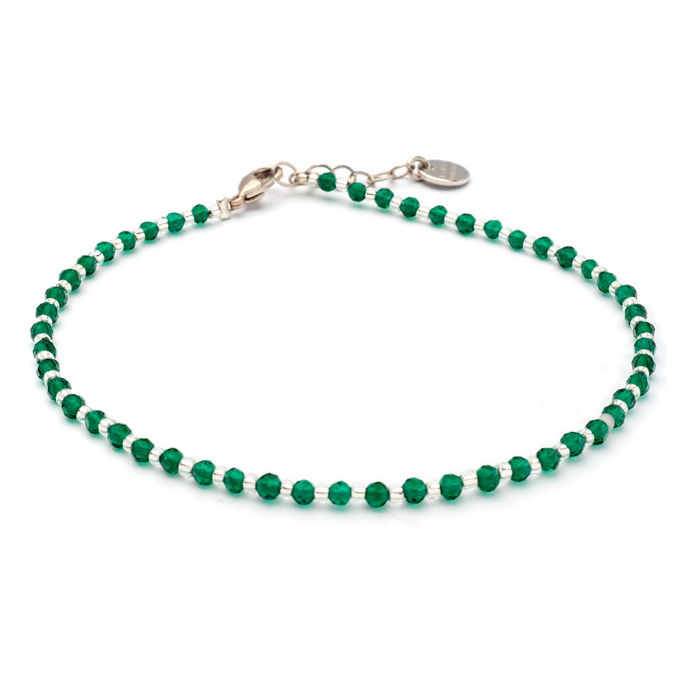 Das Armband Emerald ist ca. 16 cm lang und kann um 2 cm verlängert werden. Die Glassteine haben einen Durchmesser von 1 mm. Alle verwendeten Metallteile sind aus 18k vergoldeten bzw. versilbert-rhodinierten Messing.