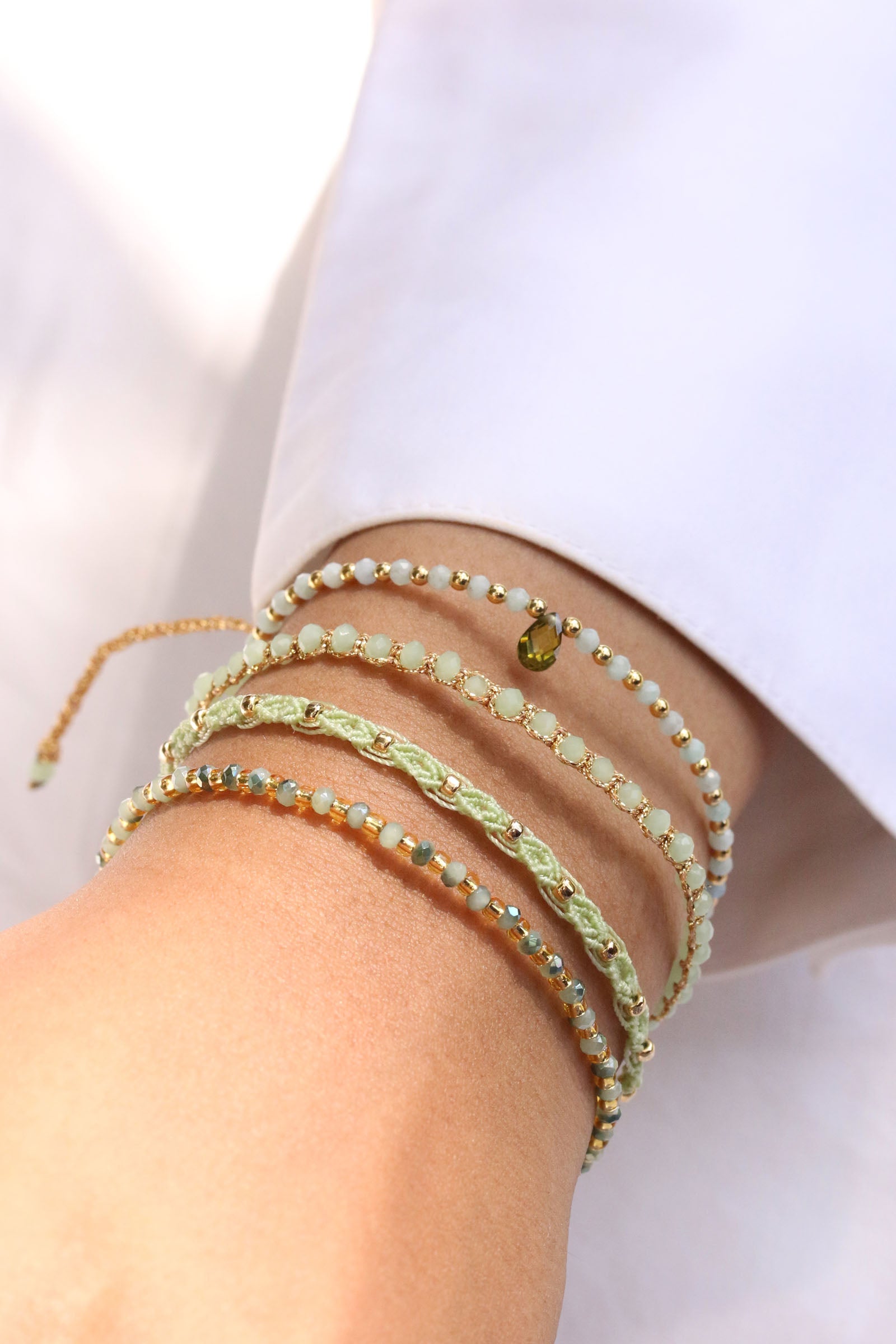 Unser Gemma-Armband in Light Green besteht aus Kristallperlen in hellen Grün-Nuancen. Der funkelnde Blickfang am Handgelenk ist auch als Halskette erhältlich.