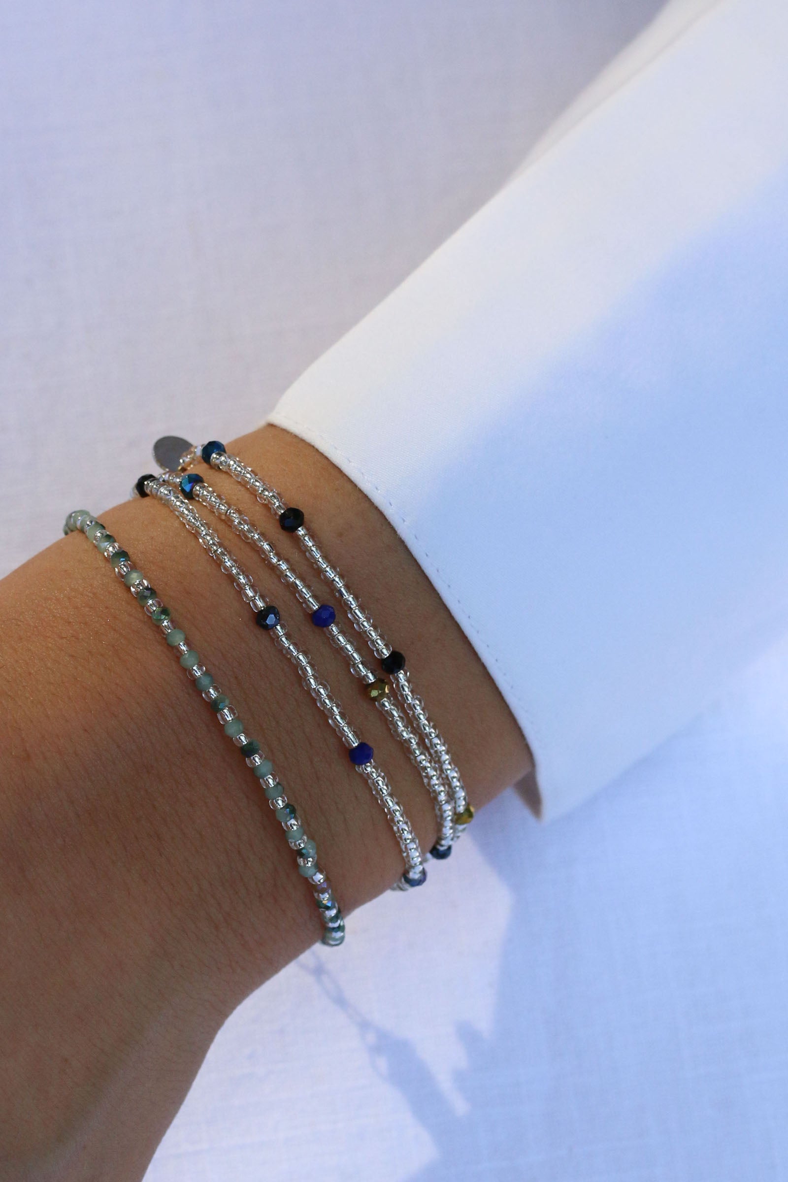 Unser silbernes Gemma-Armband in Light Green besteht aus Kristallperlen in hellen Grün-Nuancen. Das Armband setzt eine edle Note am Handgelenk - solo oder kombiniert mit unseren anderen Bali-Bändchen. Der funkelnde Blickfang am Handgelenk ist auch als Halskette erhältlich.