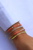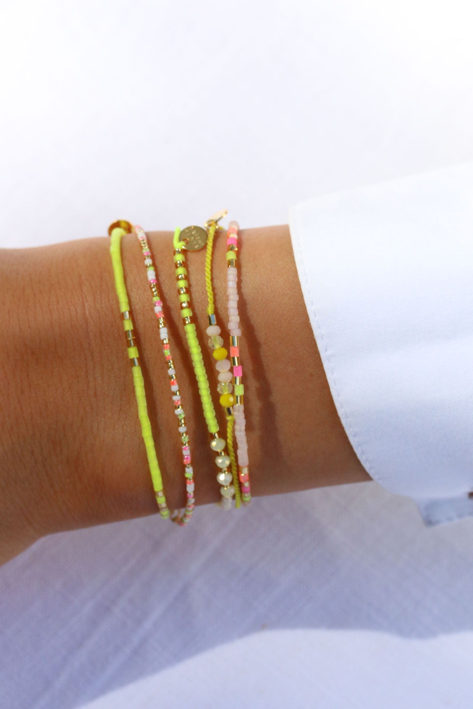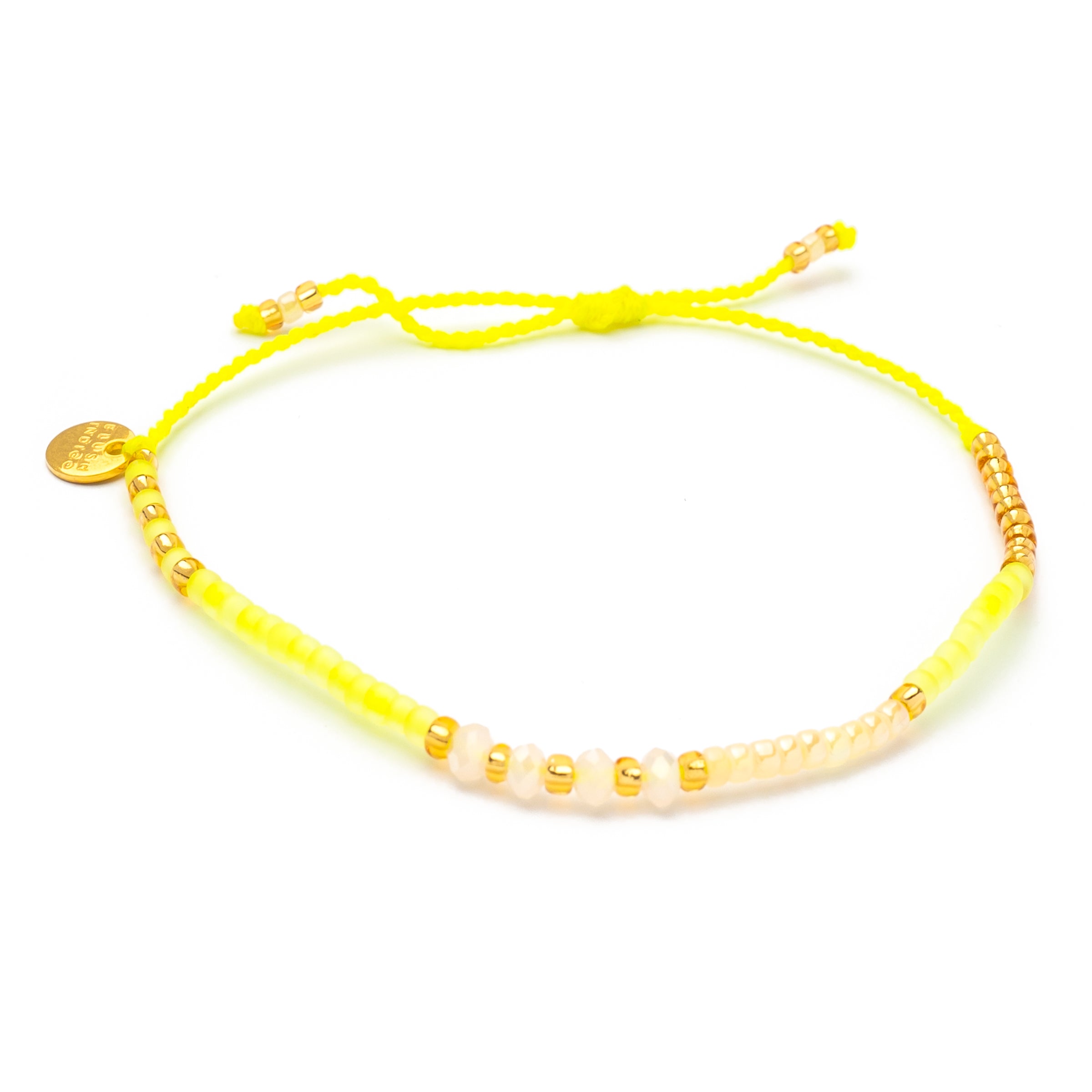 Das Armband Limoncello aus unserer Sweet-String-Serie wurde mit Sorgfalt und Liebe zum Detail handgefertigt. Matte Perlen in Neongelb und Ivory reihen sich aneinander, goldene Perlen und vier Kristallperlen in Ivory verleihen dem Armband einen eleganten Touch.
