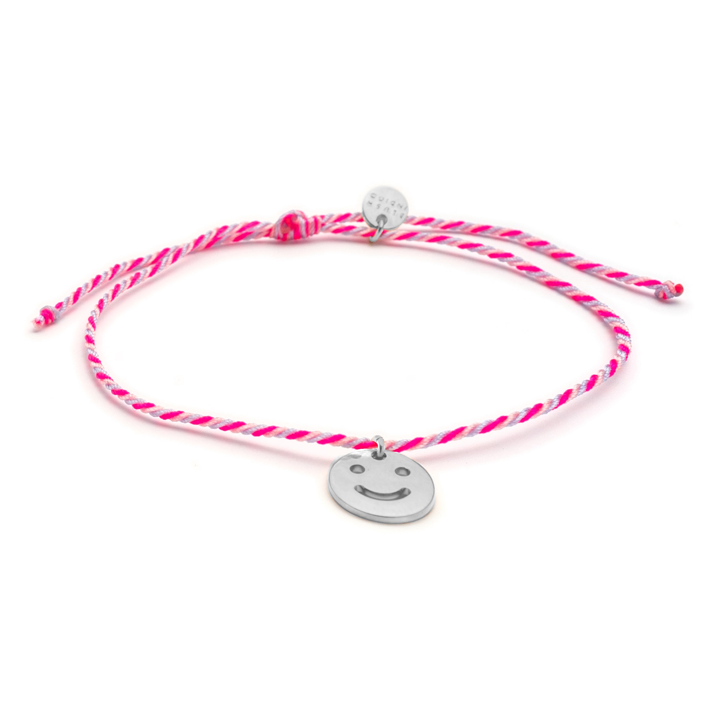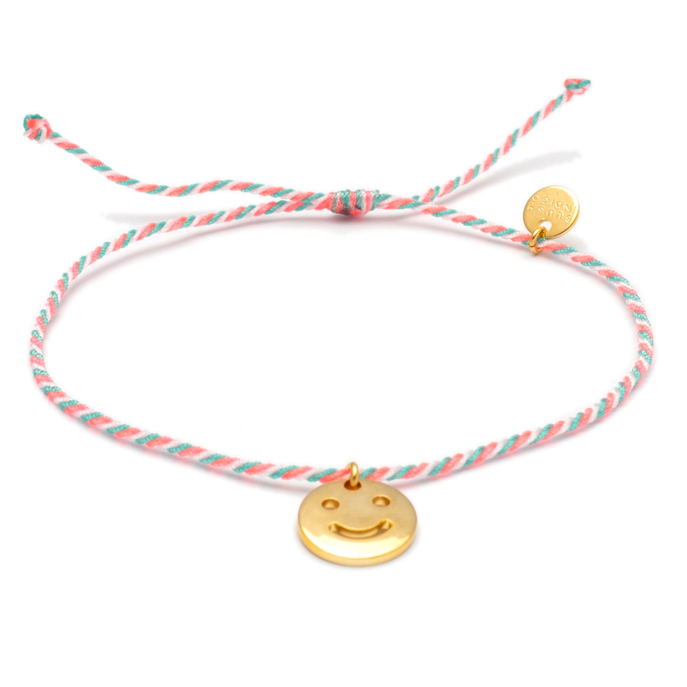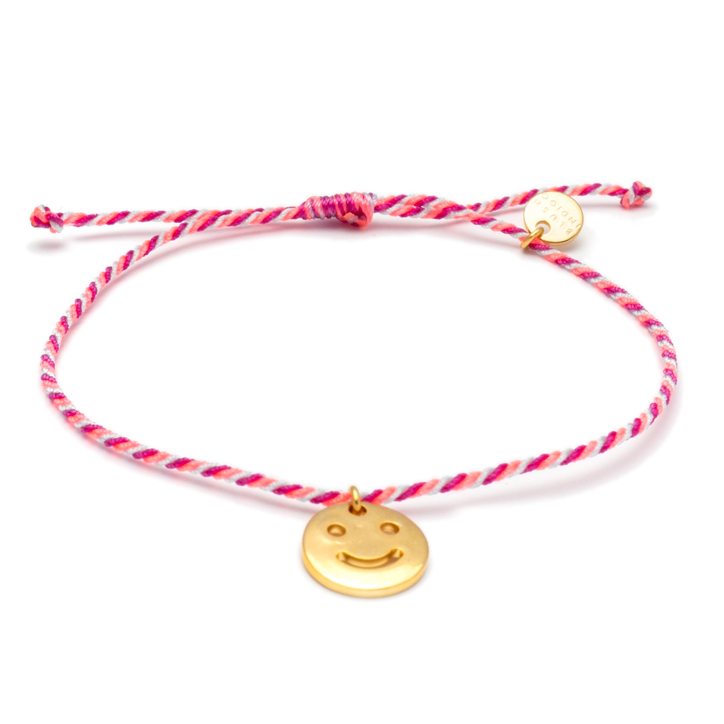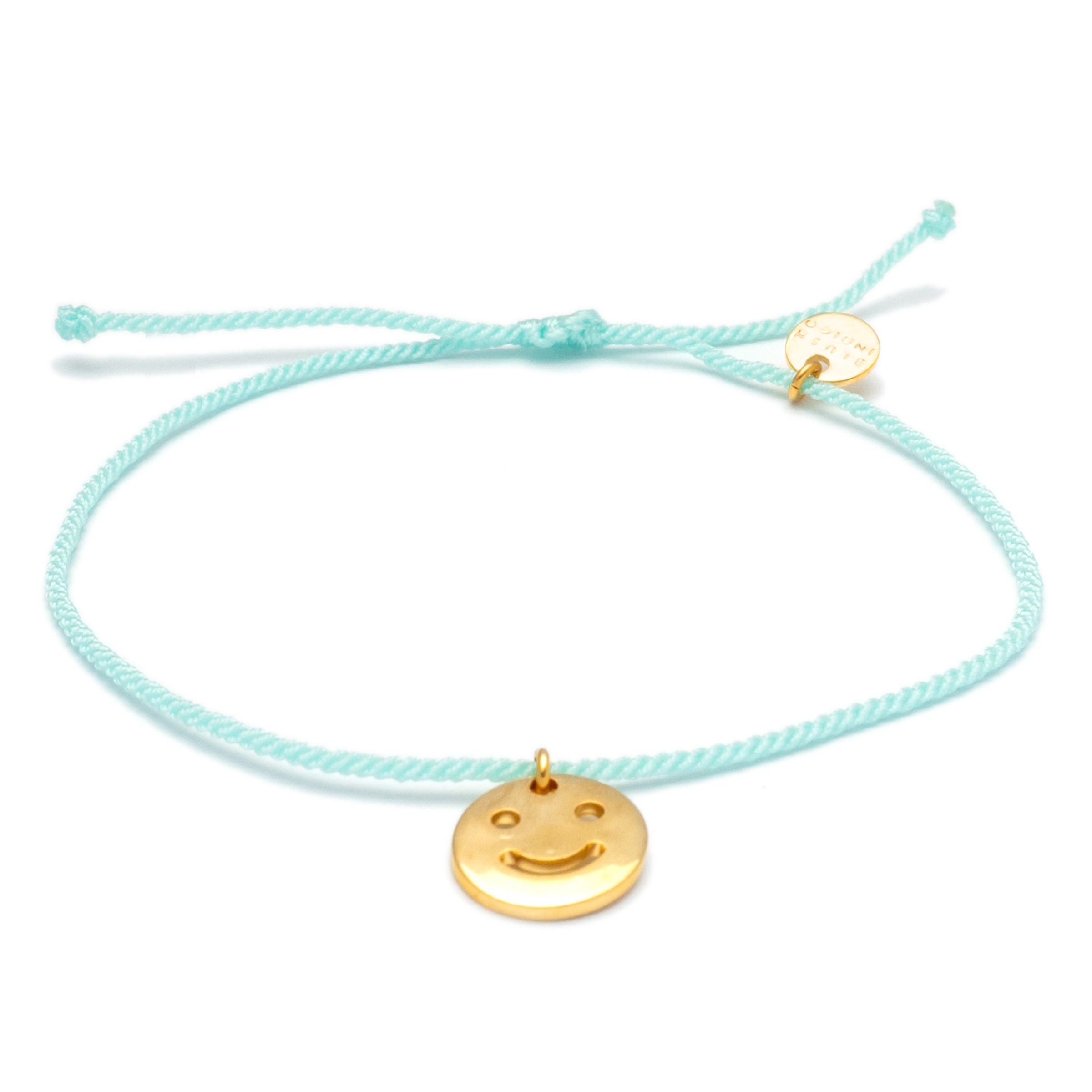 Der kreisrunde 10 mm Smiley-Anhänger ist in Gold und Silber erhältlich. Das Bändchen kann durch einen Knotenverschluss in der Größe verstellt werden. Alle verwendeten Metallteile sind aus 24k vergoldeten Messing und stammen aus Deutschland und Italien.