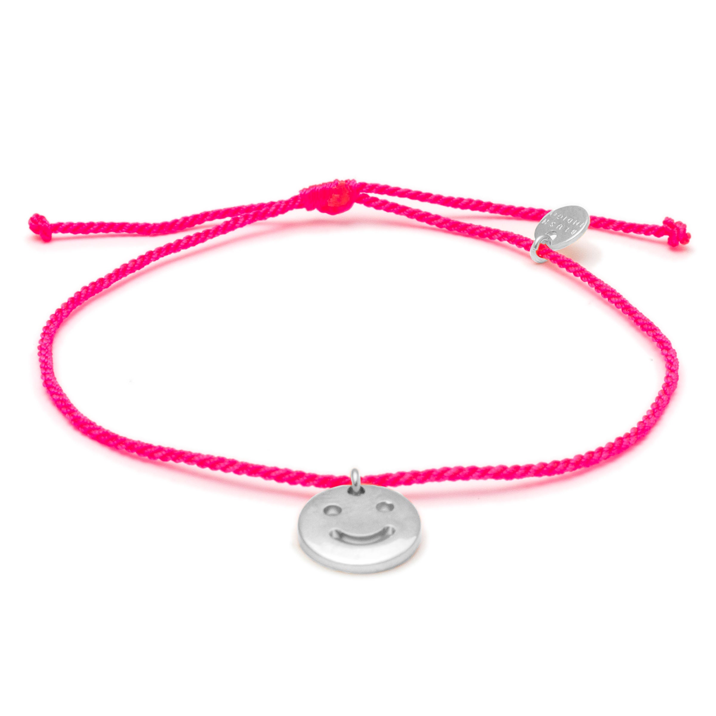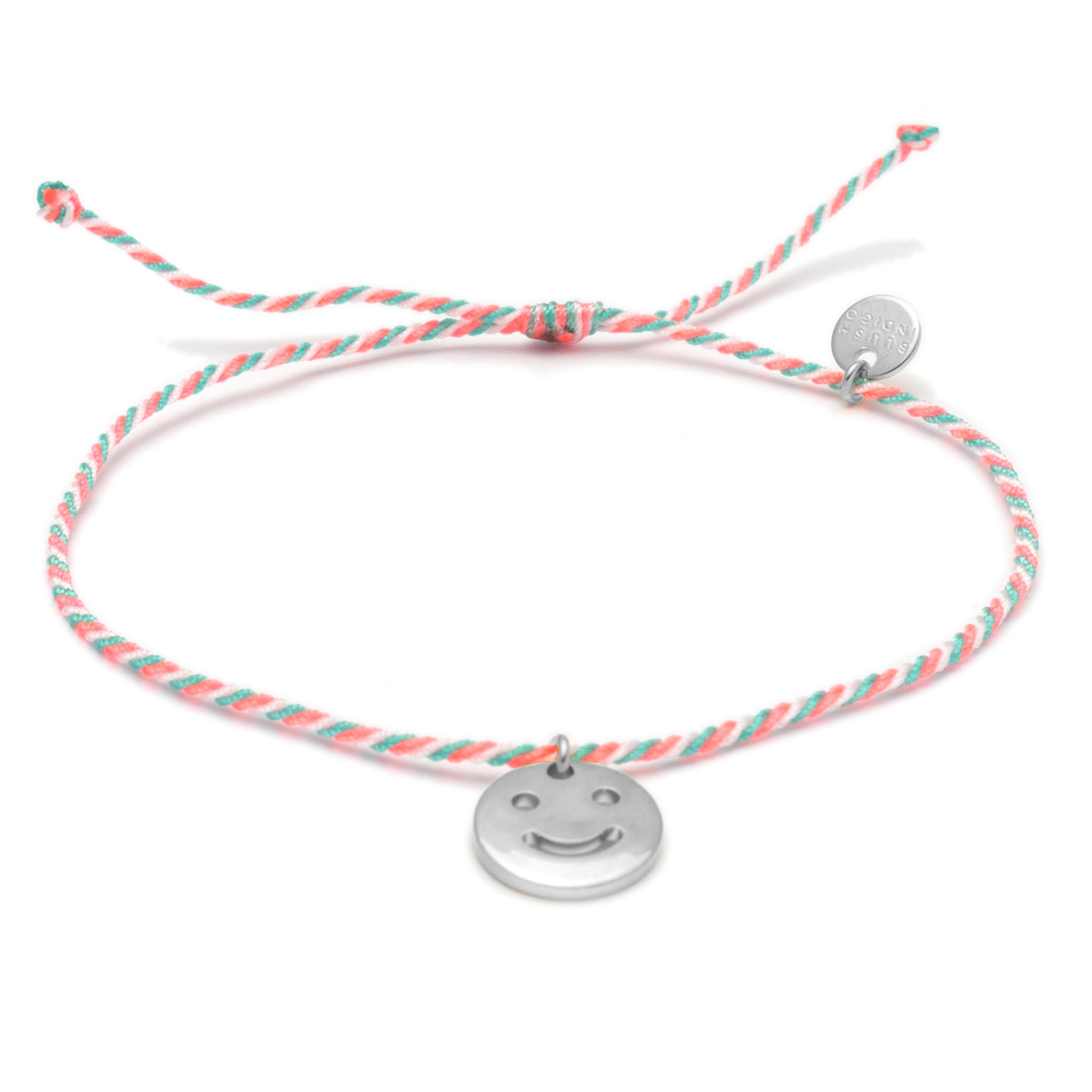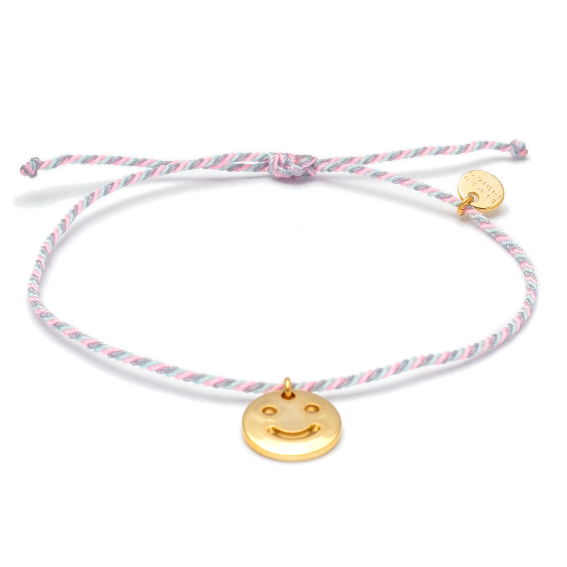 Der kreisrunde 10 mm Smiley-Anhänger ist in Gold und Silber erhältlich. Das Bändchen kann durch einen Knotenverschluss in der Größe verstellt werden. Alle verwendeten Metallteile sind aus 24k vergoldeten Messing und stammen aus Deutschland und Italien.