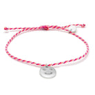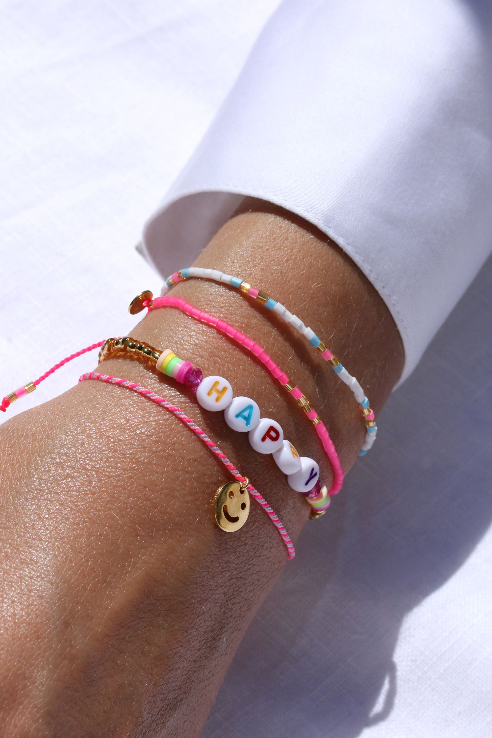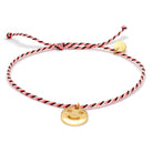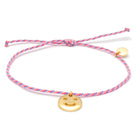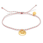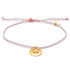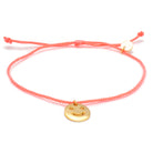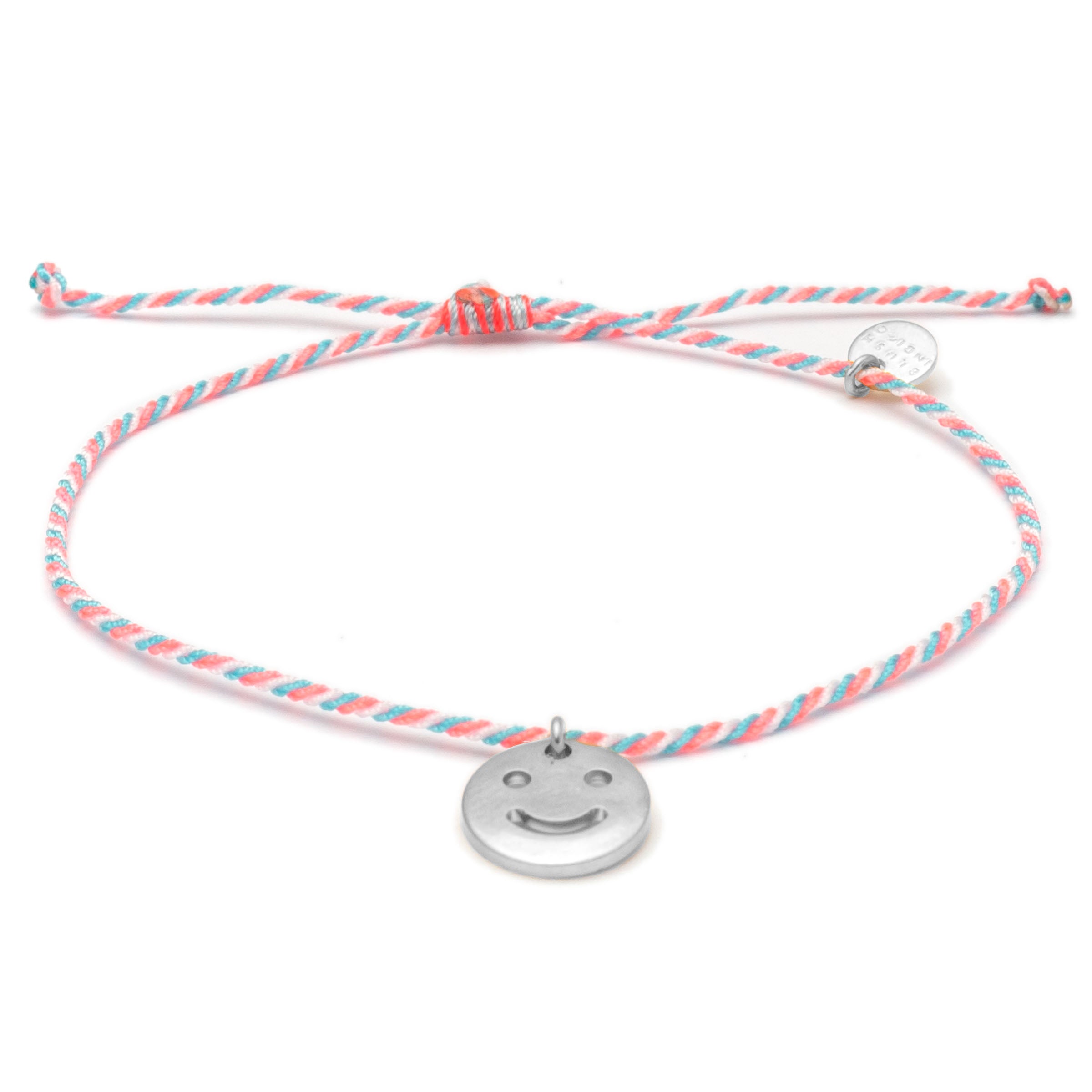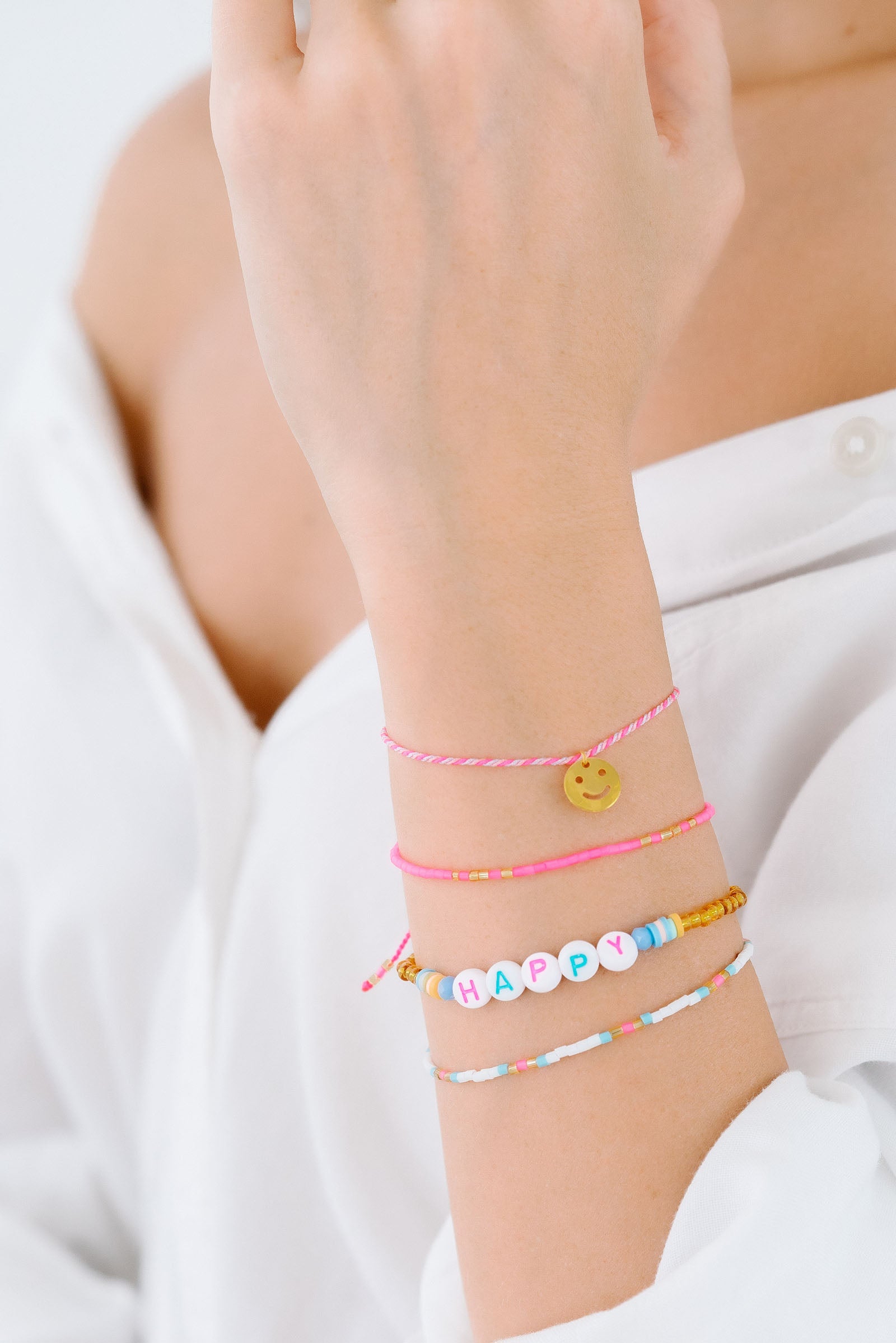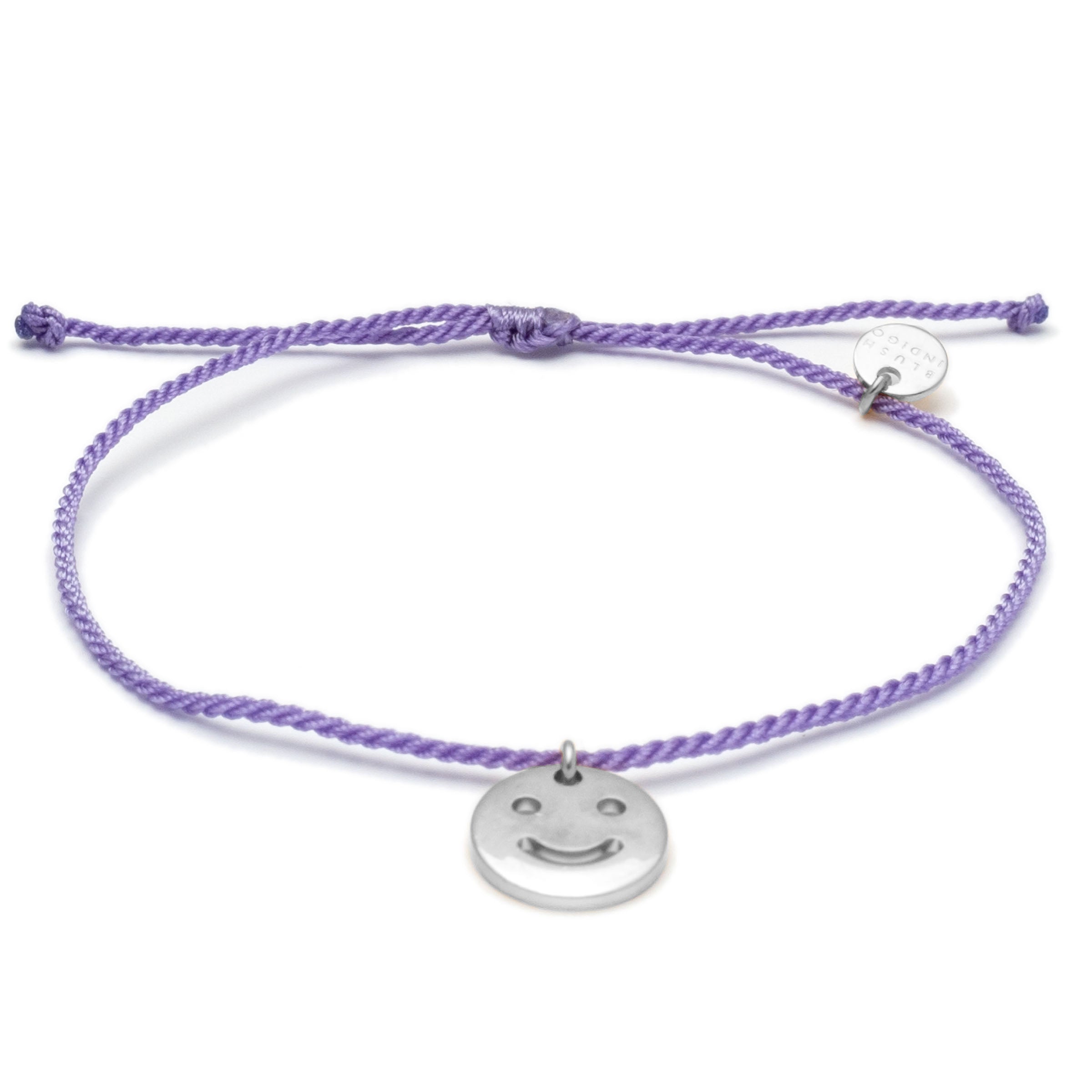 Der kreisrunde 10 mm Smiley-Anhänger ist in Gold und Silber erhältlich. Das Bändchen kann durch einen Knotenverschluss in der Größe verstellt werden. Alle verwendeten Metallteile sind aus 24k vergoldeten Messing und stammen aus Deutschland und Italien.