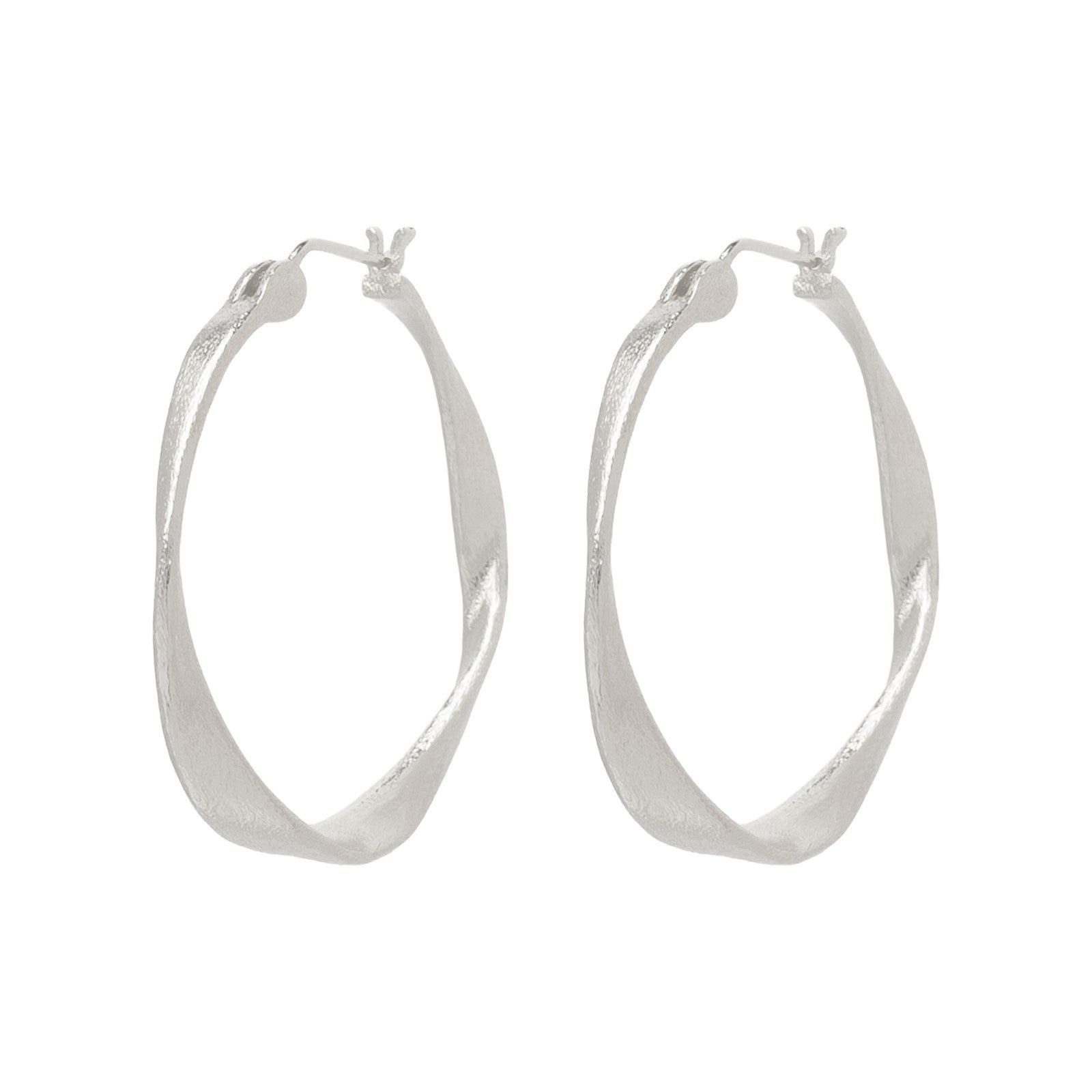 Die in sich gedrehte Form verleiht den Ohrringen eine lebendige Dynamik und unterstreicht ihre handwerklich anmutende Ästhetik. Die fein strukturierte, organische Oberfläche sorgt für ein spannendes Spiel aus Licht und Schatten und macht jedes Paar zu einem stilvollen Blickfang. Abgerundet wird das Design durch ein mattes, helles Silber-Finish.