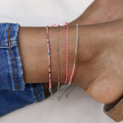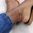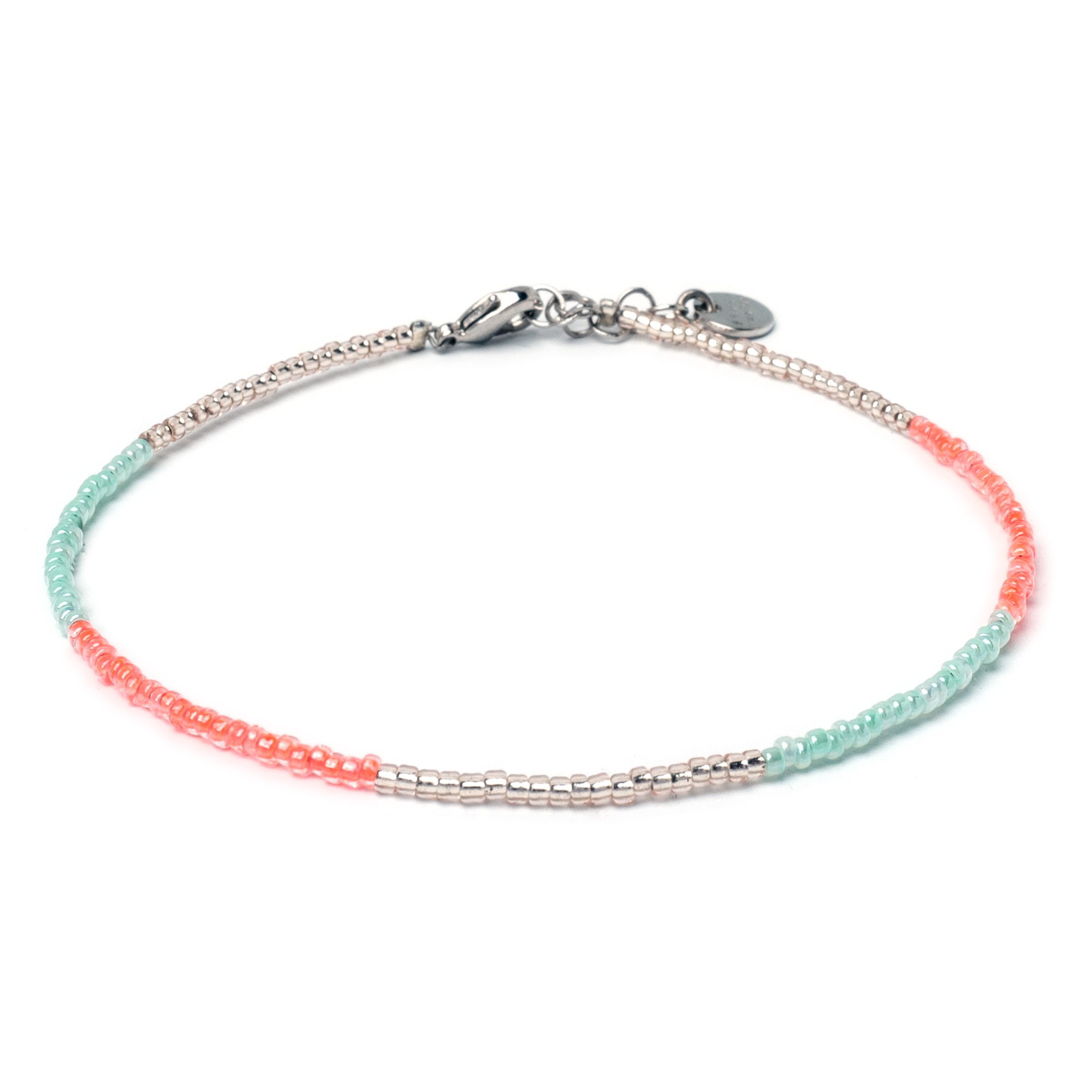 Die Anklet-Season starts now! Beim silbernen Fußkettchen Block Mix 1 haben wir die Farben Glossy Pink, Fresh Mint und Silber in Abständen von 1,5 bis 2,5 cm angeordnet. Es eignet sich hervorragend zum Kombinieren und ist auch in einer goldenen Variante erhältlich.