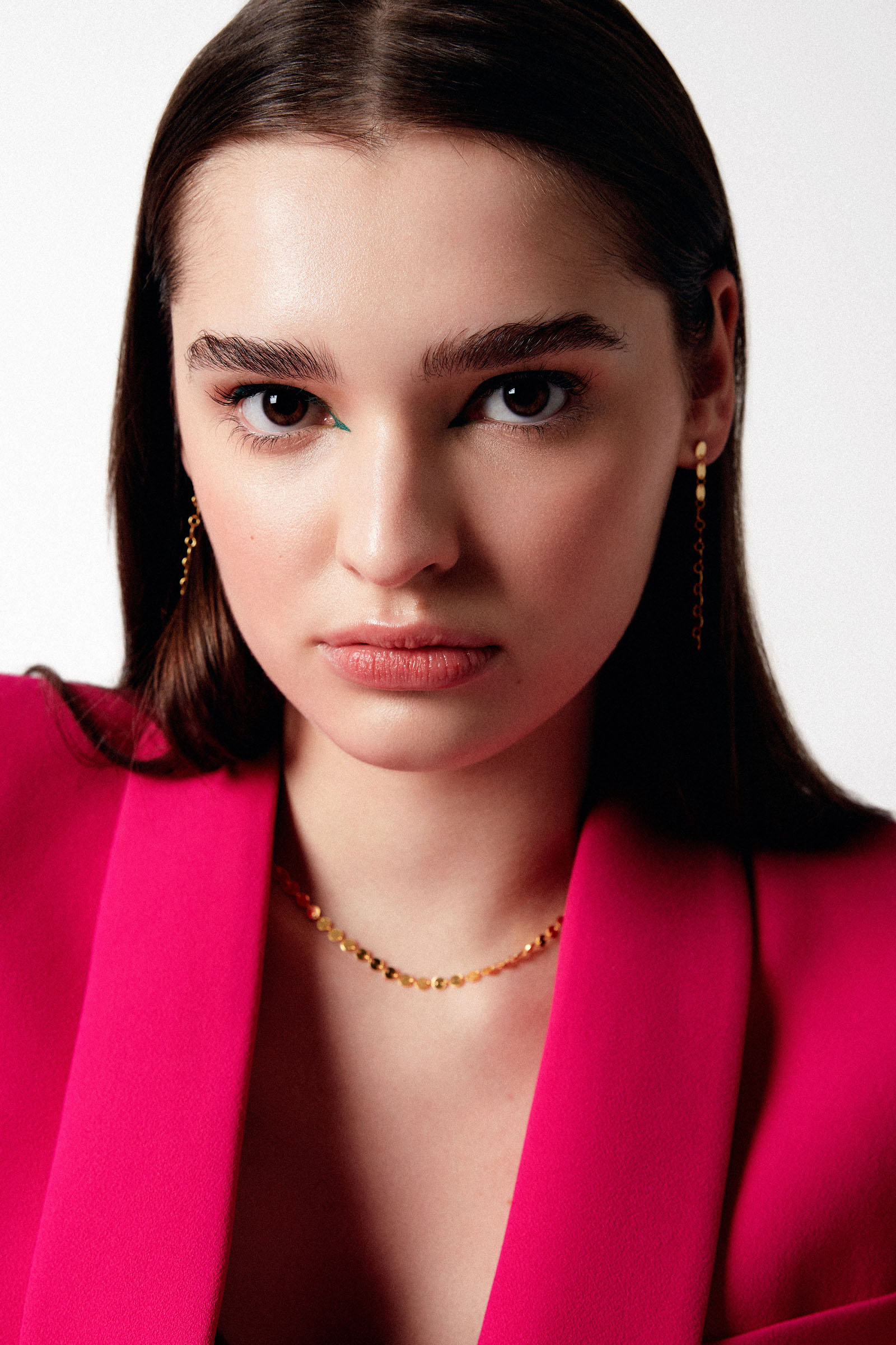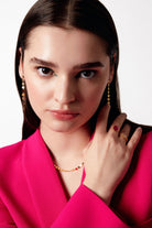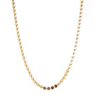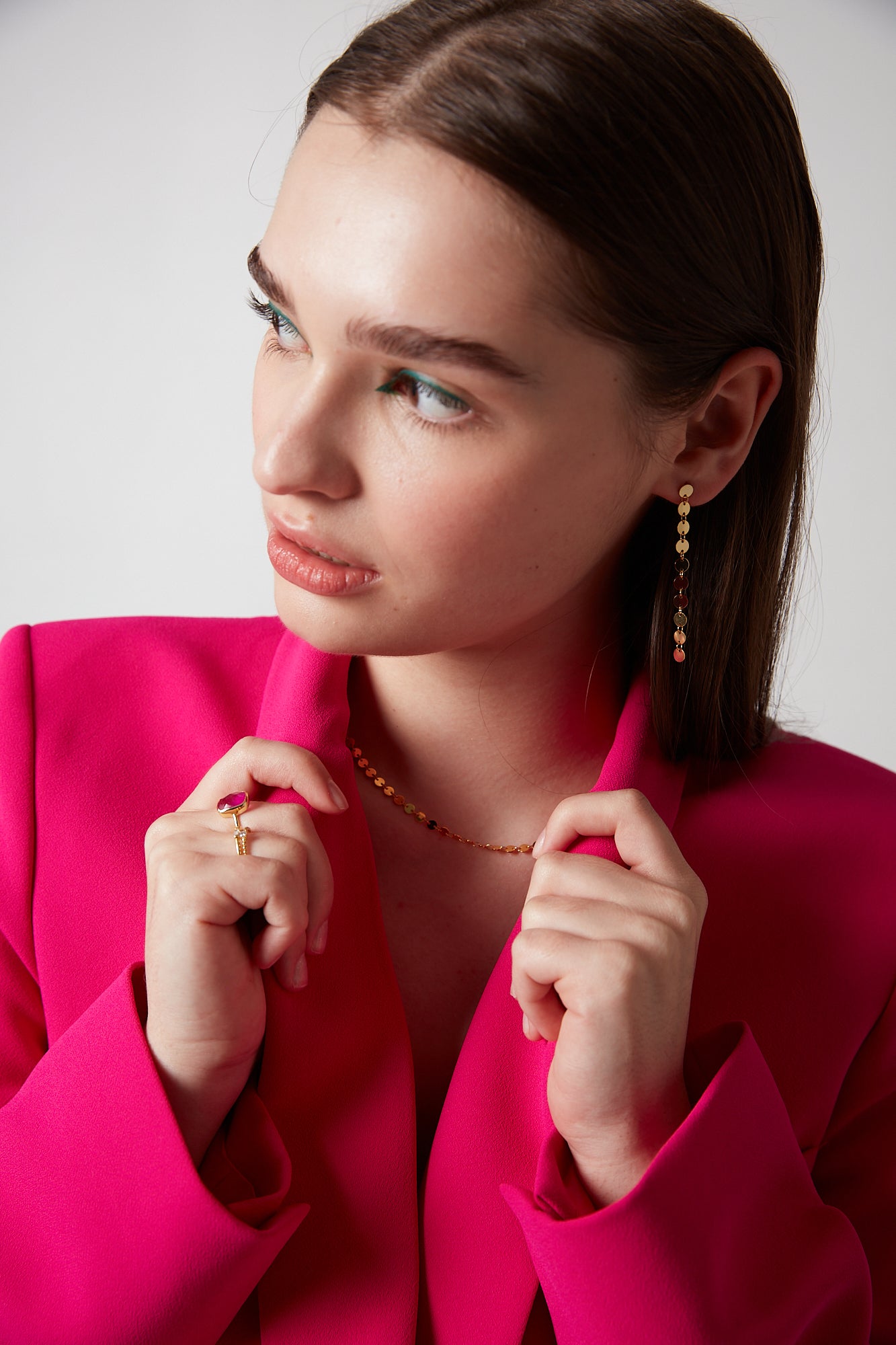 Die glänzenden, vergoldeten Plättchen liegen elegant am Dekolleté und machen unsere Kette Rialto zu einem echten Statement-Piece.