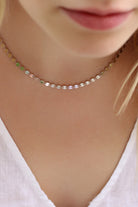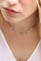 Die glänzenden, silbernen Plättchen liegen elegant am Dekolleté und machen unsere Kette Rialto zu einem echten Statement-Piece.
