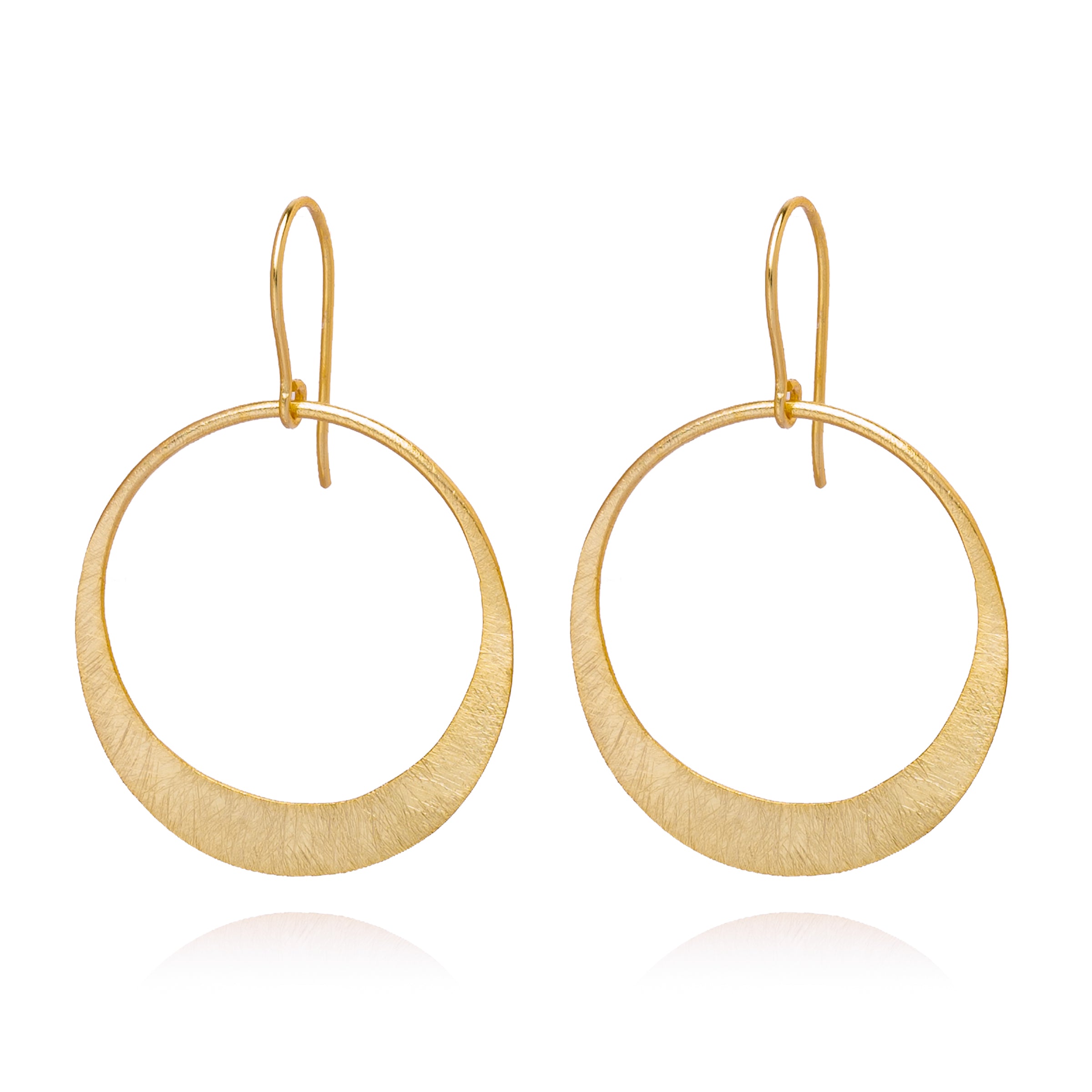 Die vergoldeten Ohrringe Odette aus 925 Sterling Silber bestehen aus einem kreisrunden, ausgeschnittenen Anhänger mit fein strukturierter, matter Oberfläche.
